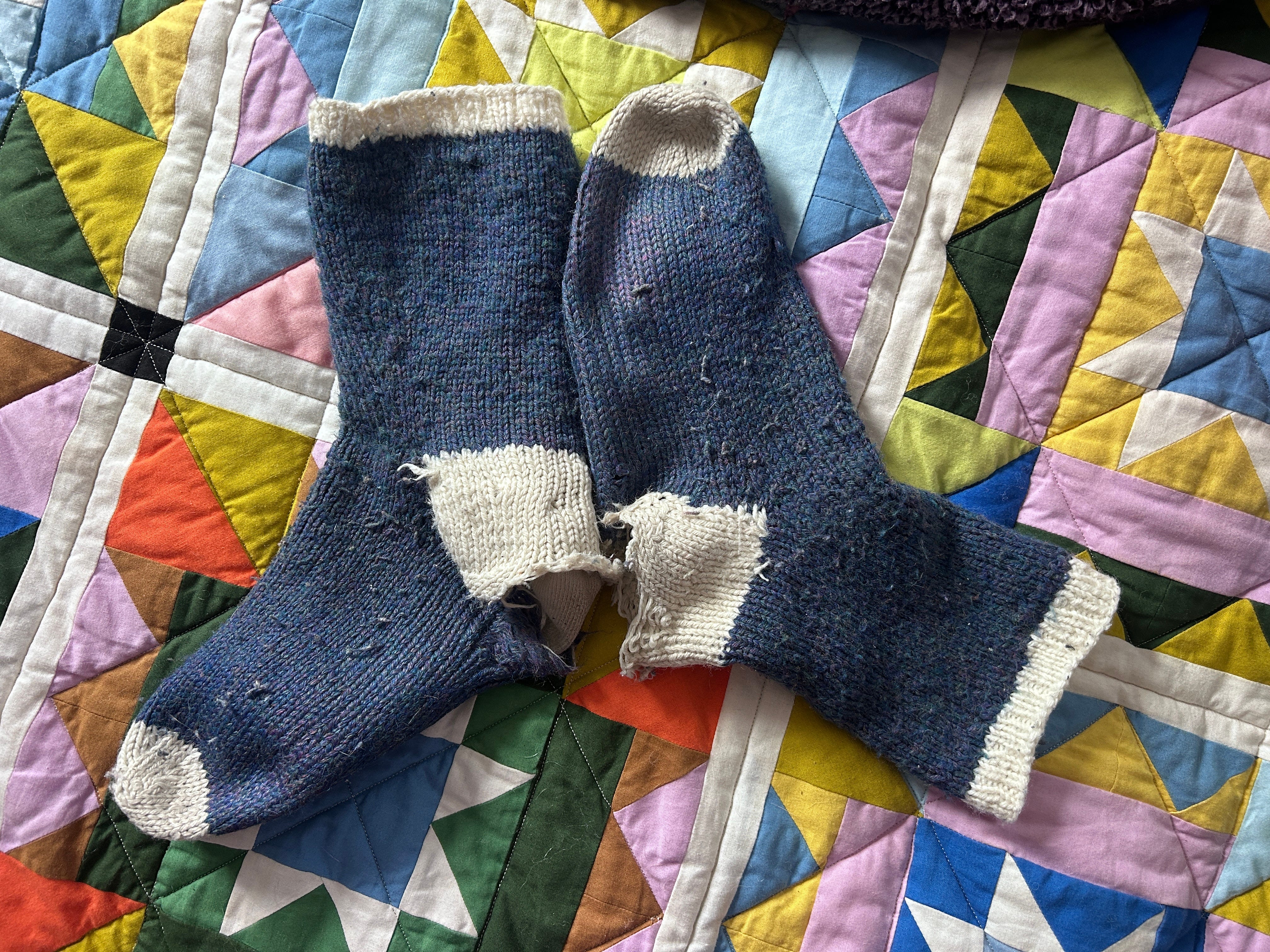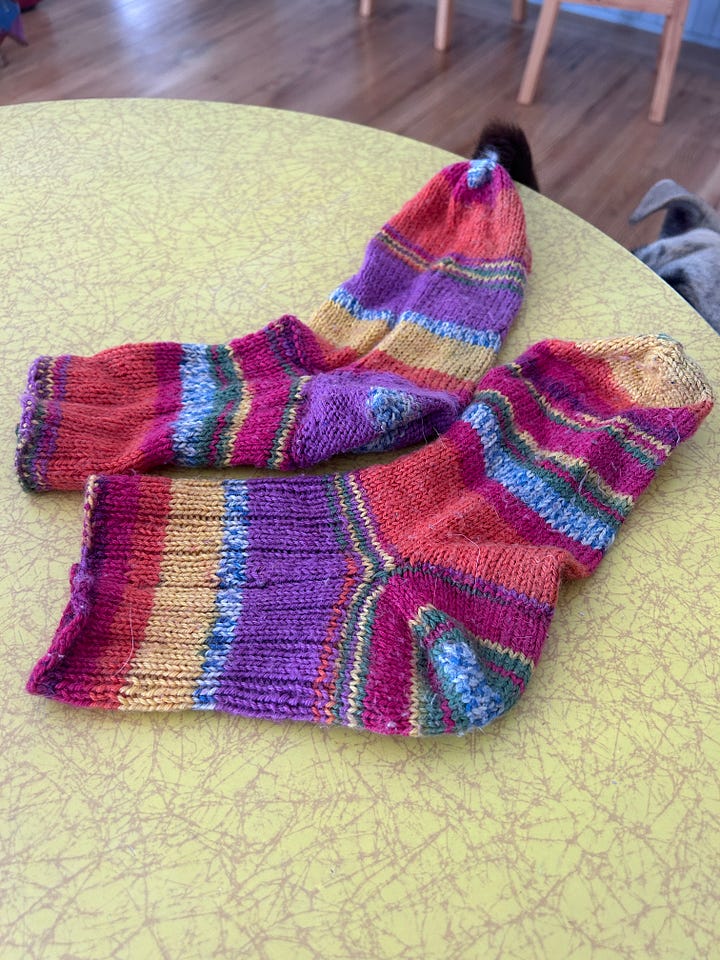 These socks were the first thing I knit. I don’t know the pattern, and I’d never heard of gauge (see more on this later), so they’re giant! Emilio has been wearing them over normal pairs of socks like slippers for five years (hence the holes 😂).