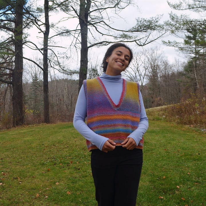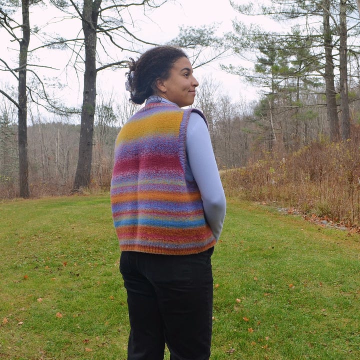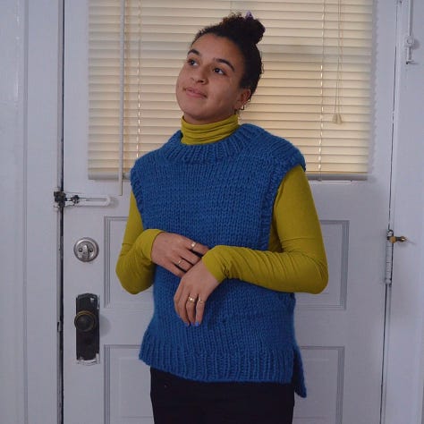 I knit this Vest No. 2 Spring Edition after getting yarn in-person at a trade show I attended for work. I think buying beautiful wool yarn in person sparked something for me—when I felt passionate about the yarn, I felt a lot more passionate about the project. I also thought harder about how I wanted the finished garment to fit into my wardrobe (I searched forever for the perfect v-neck pattern!) and the oversized fit, so I knew it would be something I’d reach for.