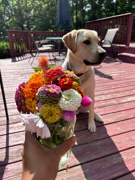 Almost all the makin’ I’ve been doing happened at the residency, so I’ll have to hold you in suspense until next month. But I have been doing a lot of livin’. Pictured here: Zinnias grown by the talented Daniela Zwischenberger of Laurelwood Blooms, my best dog friend Rio, and double croc action in an upstate-NY rowboat.