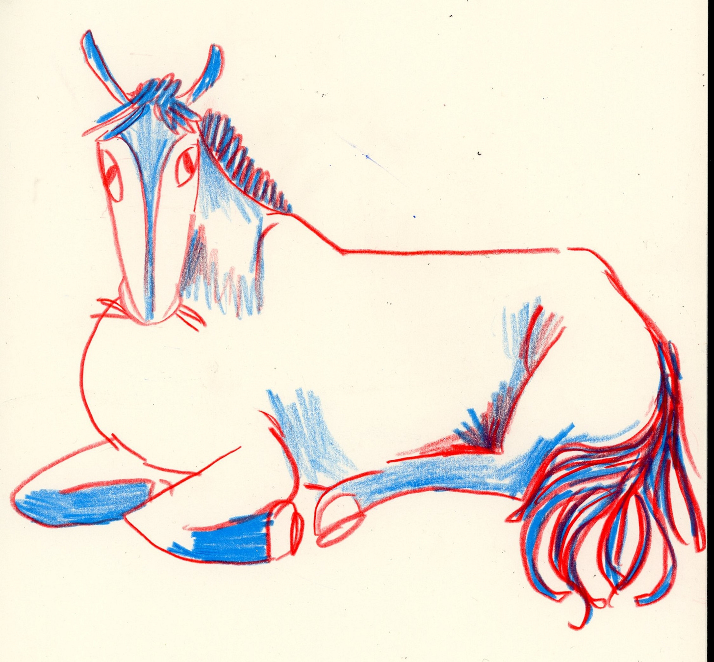 When I finally did sit down to practice for my horse, I drew the two you see here in my personal sketchbook. They were fast colored pencil drawings, meant to help me untangle the complicated anatomy of these unusual creatures so that I could contribute something, anything to the books of beauty up in the loft.