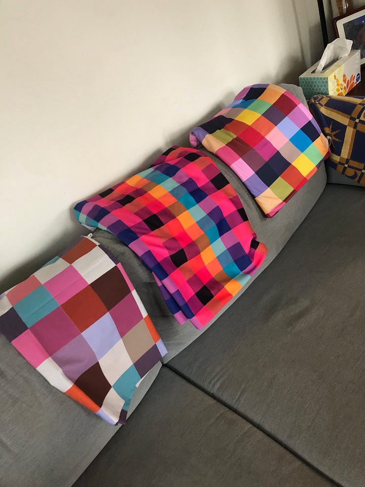 First, a fabric design project that I’ll be sharing in its entirety in December! I drew these fabric patterns (plus one more), and I can’t wait to send them out into the world and show you what I made with them. I love rainbow checks.