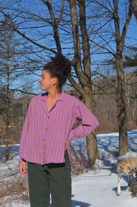 Late this year, I started to evaluate what I’m actually looking for in this kind of garment. I have a couple of thrifted button-ups that I wear constantly, and they held some answers. While I love the Genra Shirt (and have at least another in mind to sew one day), I’m looking for a pattern without a camp collar. The Jenna Shirt has a great collar stand, but the silhouette isn’t right for my vision. I also need good arm mobility, cuffs with a placket, and length that looks intentional.
