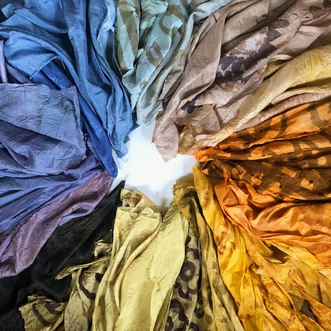But, sometimes, also, I am pulling three beautiful colors of silks out of their dye pots at the same time, holding them in my hands together and washing them in warm water, celebrating that all this color came to be through me, from me, and at the same time. I am folding 32 soft, shining, and beautiful colored silks into a box until they are ready to reach new homes. I am learning so much about natural dye, in a one-of-a-kind experimental crash course that takes my practice to a new place.