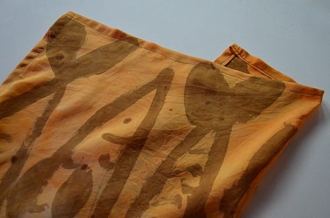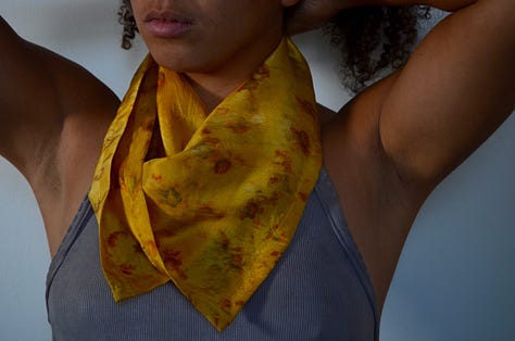 Here’s just one thing to sit with as we start the day together. In preparing for the shop update, I found myself working on a big project—designing and naturally dyeing over 30 silk bandanas with more than 10 dyes. I was having lunch with my friend Allison (the lovely model you’ll see pictured below!), and we were talking about the bandanas. I lamented to her—why did I choose to make SO MANY? I’ve never sold these before, and I don’t know if people will want to buy them. I have to remember and execute so many different dye times and processes. I have a high cost in silk to recoup. I was feeling like I had bitten off more than I could chew.