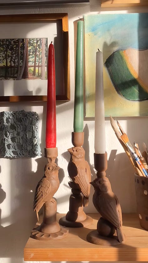 I have fallen quickly and obsessively in love with the work of Sarah Conti this month. She’s a ceramic sculptor making gorgeous (and sometimes utilitarian) pieces featuring birds and other animals. She’s inspiring me big time, and making me want to open up my clay tub. I hope to one day score one of her out of this world candlesticks.