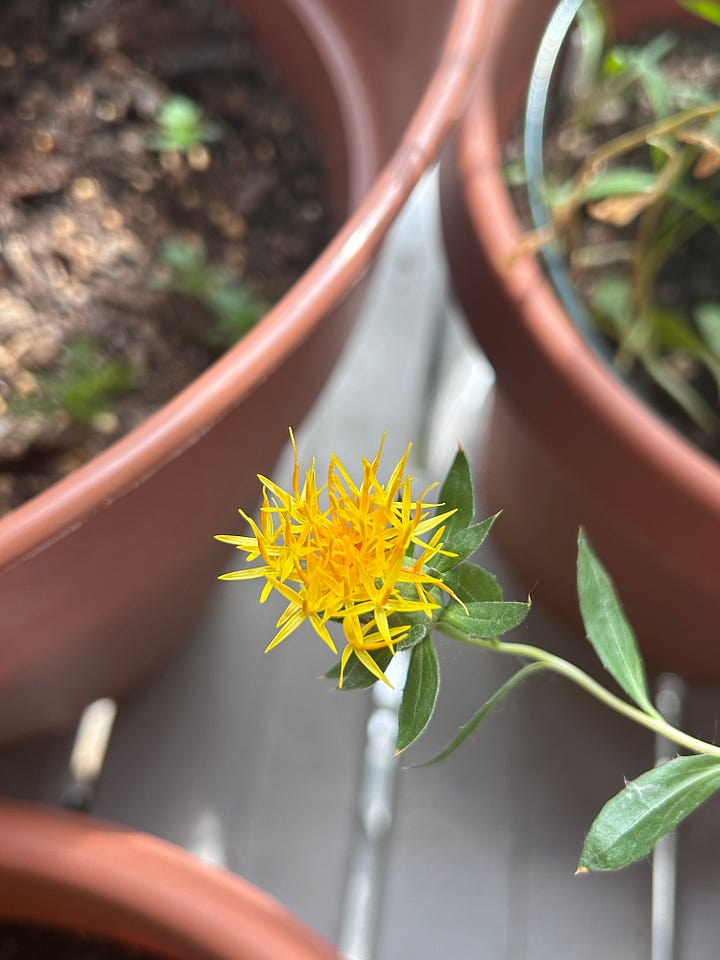 This month was often too full for making (:/), but I have some updates. First, my tiny garden is doing better than it did last year! It has many limitations (that I work to accept), but it’s producing flowers, and that’s pretty cool. In addition to this safflower (my first ever!), I’ve gotten tango cosmos, coreopsis, a black magic bachelor’s button, and my indigo is still kicking.