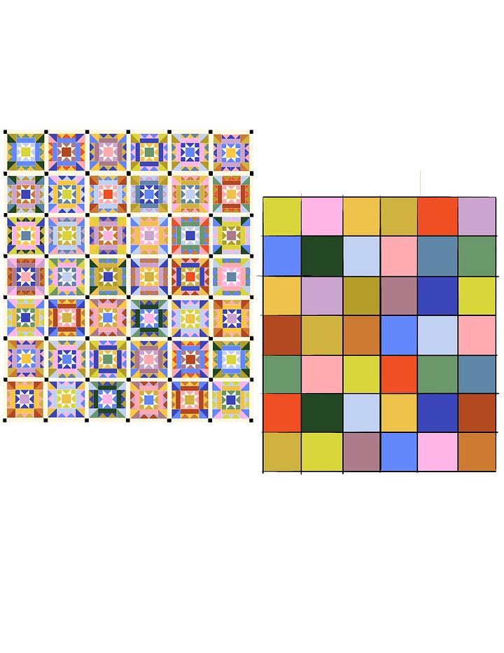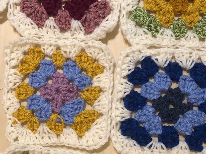 I’ve been thinking in blocks! I’m sharing a glimpse of two textile projects that have been happening in the wings. First (left) is a granny square crochet piece that I started on a sick-day. I hadn’t crocheted since 2016, but this was an easy project to pick back up and it’s a fun use of old scrap yarn.