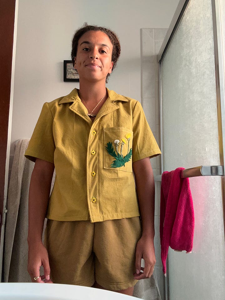 I am not working in a creative sprint right now. I’m just kind of taking everything day by day. Sometimes that does include making stuff, which is nice. I finished cutting out all the block shapes for my bed quilt. It was more fun than I expected, largely due to my perfect custom cutting templates. I also finished this shirt (and another matching one) last week. Giving you a shot of it here before it even hits IG! I LOVE the fabric, and tried my hand at felt appliqué for the dandelion pocket. Overall very into it.